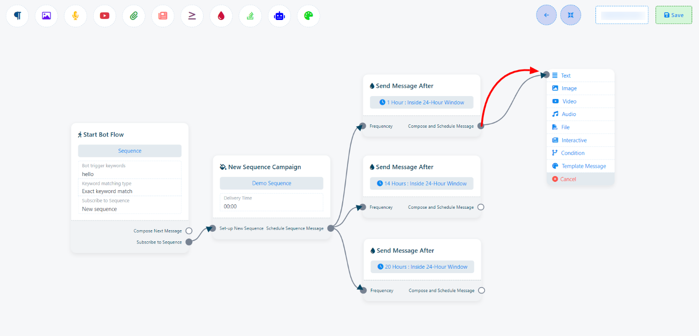 NB. When it comes to sending daily messages in a sequence, WhatsApp exclusively permits the use of pre-approved `Message templates`. In the daily sequence message WhatsApp doesn’t allow regular reply messages. Further details on creating and utilizing these message templates will be provided in this documentation.