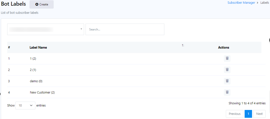 Labels are used to segment subscribers list with a tag. To manage labels, click on the `Manage Labels` field in the Subscriber Manager. From here, creating new labels and deleting any existing labels are done.